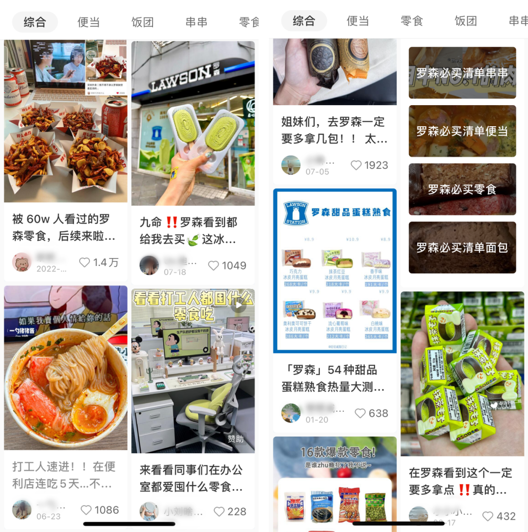 在小红书、抖音、豆瓣等社交平台上,罗森被称为上班族的“零食天堂”,因为总能在那里找到新奇好吃的零食;也有人称它是打工人的“白月光”,一日五餐都可以在罗森解决。在这些平台上,不乏关于“罗森必买商品”、“罗森网红甜点测评”,“罗森各种IP主题店打卡”、“IP产品兑换攻略”等网友总结的各种经验分享贴,甚至还有人专门整理了罗森每天的补货时间表,帮助网友买到想要的商品。